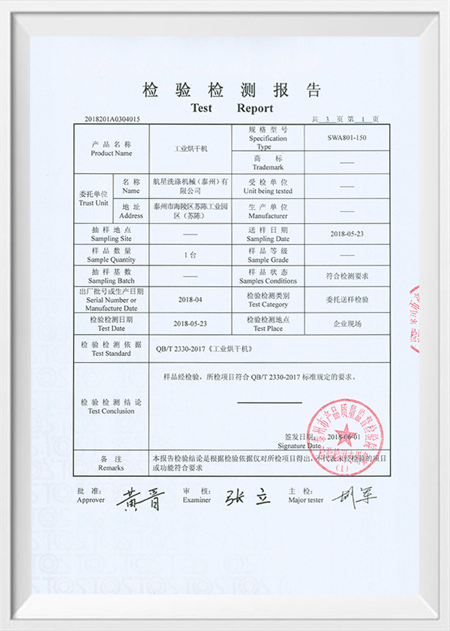 Spoločnosť Hangxing sa zaviazala zabezpečiť kvalitu a výkon svojich výrobkov prostredníctvom procesov a vybavenia v pokročilých výrobách a zabezpečiť, aby zaujala dôležité postavenie na domácich a zahraničných trhoch. Spoločnosť získala certifikáciu systému ISO9001 Medzinárodného systému riadenia kvality a certifikáciu bezpečnosti EÚ CE, ktoré poskytujú silnú podporu konkurencieschopnosti spoločnosti na globálnom trhu. Ako sušička OEM/ODM, Hangxing Prack Machinery (Taizhou) Co., Ltd. poskytuje výrobky vrátane priemyselné sušičky a komerčné sušičky . Každá kategória výrobkov je možné prispôsobiť podľa potreby zákazníka, aby poskytla personalizované riešenia.